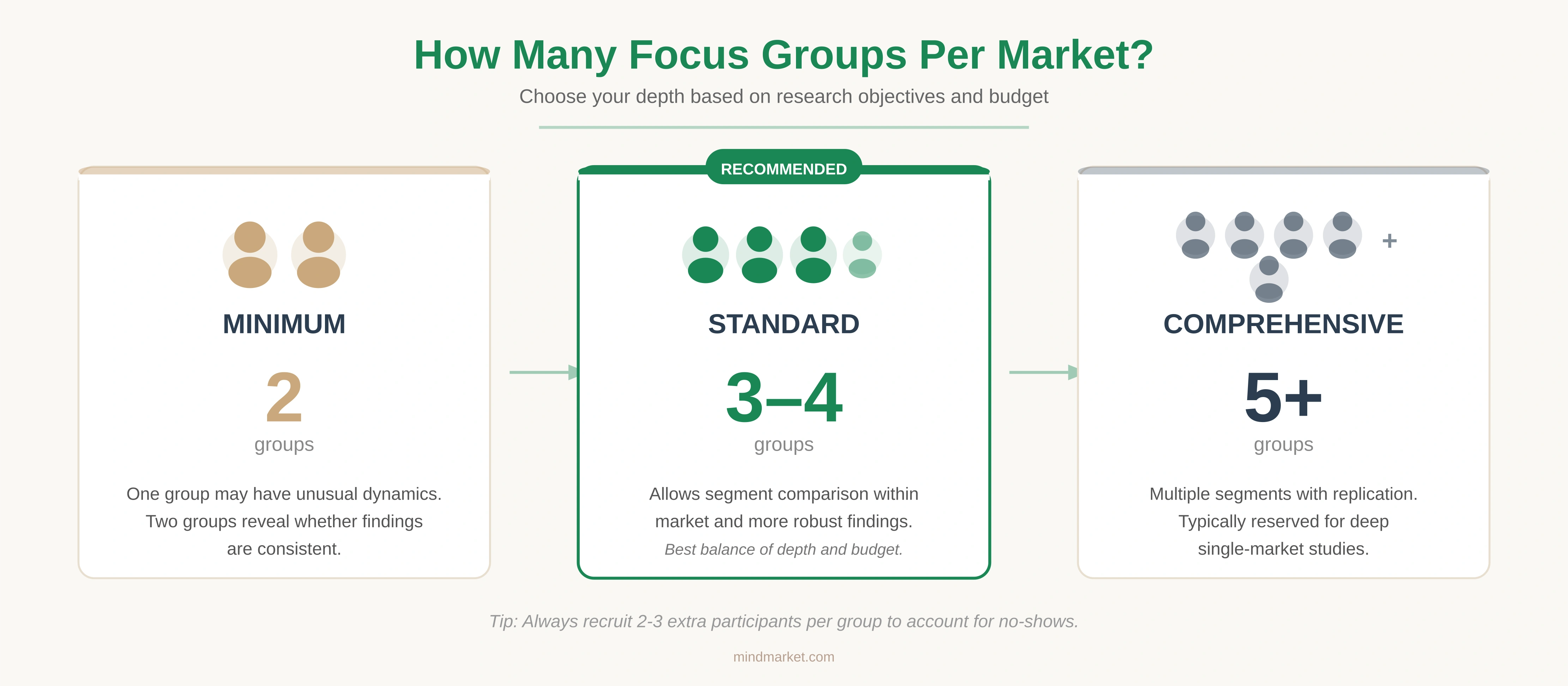 Comprehensive: 5+ groups. Multiple segments with replication. Typically reserved for deep single-market studies.